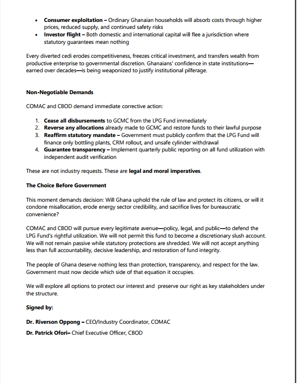 In a joint statement signed by COMAC CEO Dr. Riverson Oppong and CBOD CEO Dr. Patrick Ofori, the industry groups said the move undermines the fund’s legal mandate and threatens national energy safety policy.