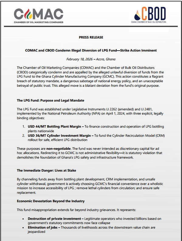 Ghana’s Chamber of Oil Marketing Companies and Chamber of Bulk Oil Distributors on Thursday condemned what they described as the unlawful diversion of money from the country’s Liquefied Petroleum Gas (LPG) Fund to the Ghana Cylinder Manufacturing Company, warning that industrial action could follow if the decision is not reversed.